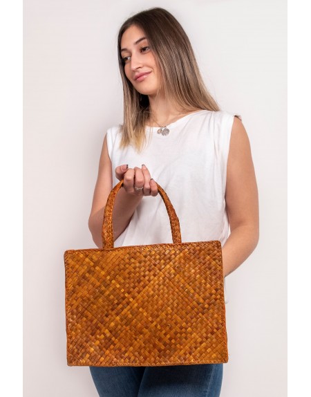 Descripción: Bolso artesanal de gran capacidad elaborado con fibras naturales trenzadas en tonos marrones. Su diseño amplio y resistente, junto con asas cómodas, lo convierte en una opción ideal para el uso diario, compras o llevar todo lo necesario con estilo y elegancia.