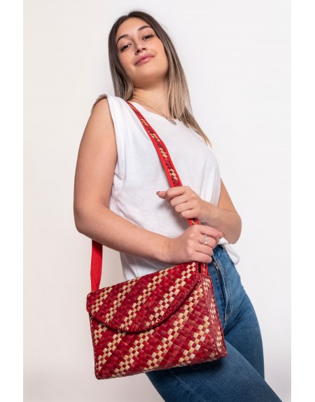Descripción: Bolso artesanal tipo bandolera elaborado con fibras naturales trenzadas en tonos multicolor. Su diseño compacto y ligero, junto con su asa larga, permite llevarlo cómodamente cruzado o al hombro, siendo ideal para el día a día o para ocasiones informales.
