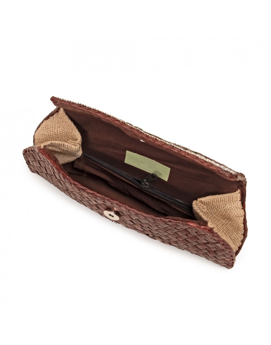 Descripción: Bolso artesanal tipo clutch elaborado con fibras naturales trenzadas en tono marrón, con diseño compacto y cierre superior. Perfecto para llevar lo esencial con un estilo elegante y minimalista, ideal para ocasiones especiales o salidas.