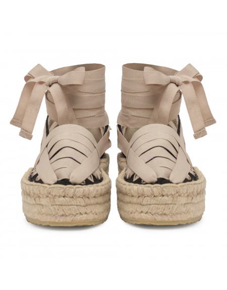 Modelo beige elegante estilo veraniego con plataforma tipo esparto, diseñada para aportar altura, comodidad y un toque elegante. Su diseño con tiras y sujeción al tobillo garantiza un ajuste seguro, mientras que la cuña estiliza la figura sin renunciar al confort.
